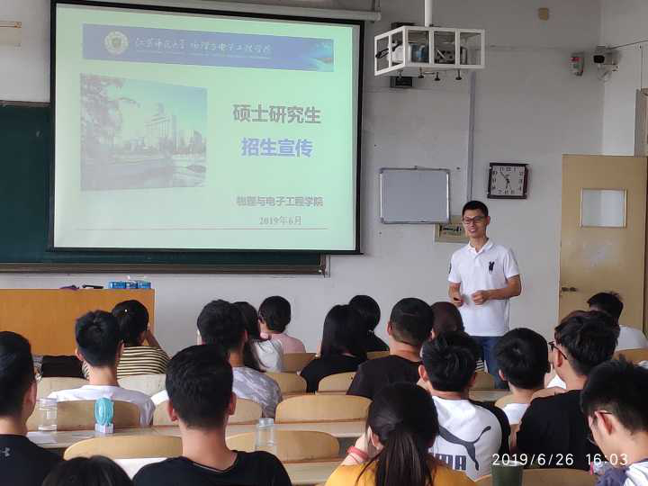为使学生更好地了解大学生活的真正意义,充分调动新生学习的积极性和主动性,2019年6月26日,开云kaiyun体育于求真楼4010教室开展了以“放飞青春梦想,书写青春华章”为主题的励志讲座,本次讲座特邀德州学院优秀校友、法国里昂大学博士、江苏师范大学石景明老师担任主讲,2016、2017级物理学、应用物理学全体学生以及部分电子专业学生参加了讲座。