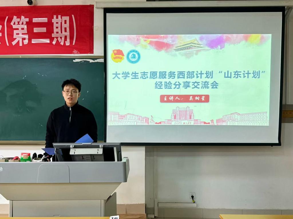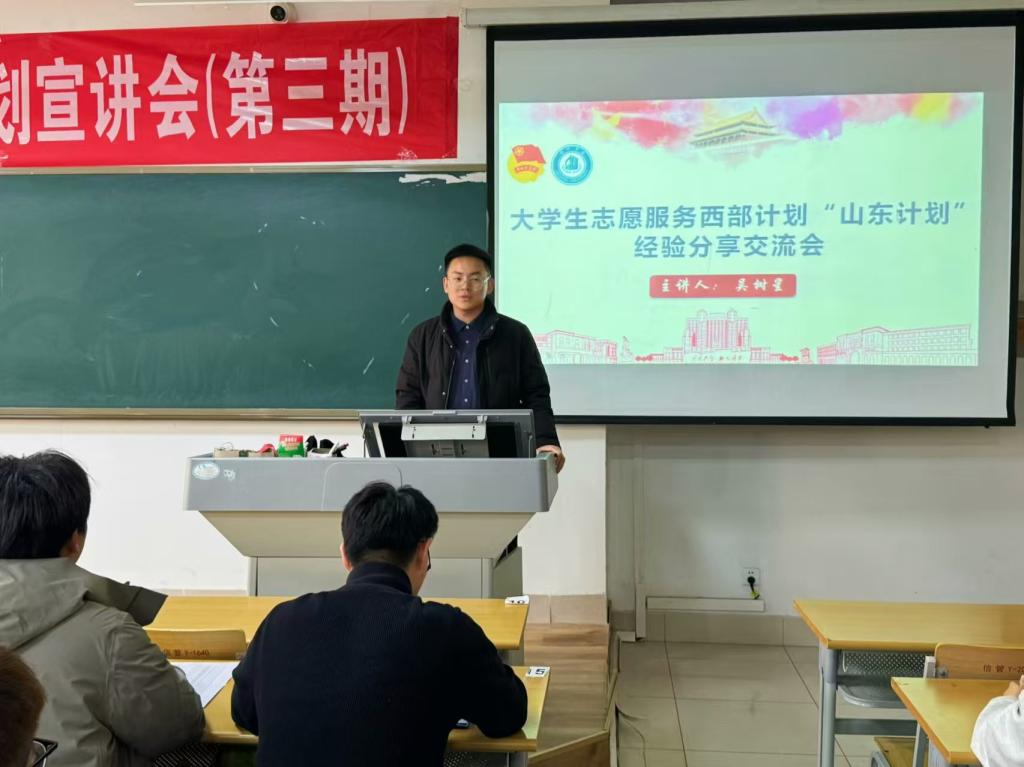 宣讲会伊始,开云kaiyun体育团委书记贾延琨老师简要介绍了大学生志愿服务西部计划的政策背景、招募流程及保障机制,并鼓励学生结合专业特长投身基层服务。本次宣讲会特别聚焦山东省大学生志愿服务乡村振兴计划,特邀山东省大学生志愿服务乡村振兴计划优秀志愿者、美术学院吴树星老师进行专项经验分享。作为该计划参与者,吴树星老师系统阐释了山东省大学生志愿服务乡村振兴计划的政策背景、战略意义、服务领域及报名通道,重点解析了基层服务岗位设置与专业适配性,帮助物电学子精准把握"专业+乡村振兴"的实践路径。宣讲会最后,秘书处于瑞娇同学精心策划并带领完成“风车时光邮筒:寄给未来的自己”,同学们在信笺上写下对未来自己的寄语或服务承诺。