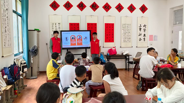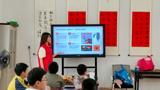 志愿者们首先来到滕州市大坞镇“凫山快乐营”,开展“两弹一星” 精神宣讲活动和普通话推广活动。志愿者们以精心制作的PPT、生动影像资料为载体,用孩子们听得懂的语言讲述“两弹一星”研制历程:从科研工作者在戈壁荒漠中攻坚克难的坚守,到核武器与人造卫星成功研制对筑牢国防屏障、提升国际话语权的里程碑意义,一个个鲜活故事让孩子们聚精会神。“原来国家的强大,背后有这么多人默默付出!”一名孩子的感慨道出心声,科学先辈的执着信念在他们心中种下“向学报国”的种子。普通话推广环节同样亮点纷呈。志愿者们从日常词汇、基础句式入手,借助儿歌传唱、故事演绎等趣味形式点燃学习热情。随后开展的朗诵比赛、情景对话等互动活动,让孩子们在轻松氛围中大胆开口,从羞涩试探到流利表达,仅一上午时间,孩子们的普通话交流能力显著提升,脸上洋溢着自信的笑容。