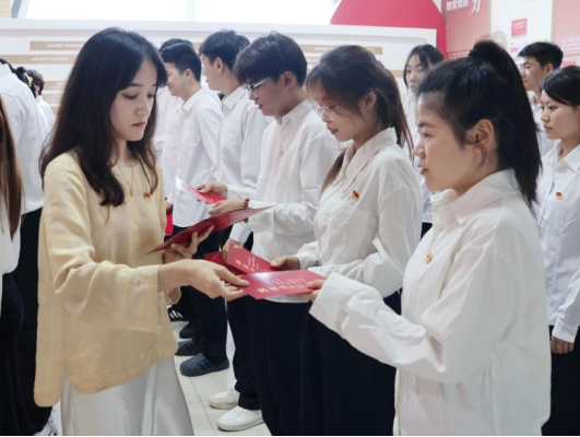 活动现场,全体党员高举右拳,在鲜红党旗前,跟随领誓人齐声宣读入党誓词。铿锵有力的誓言回荡,不仅是对入党初心的深情回望,更是对新时代使命的郑重承诺。第三学生党支部宣传委员宋言昕为党员们送上精心准备的政治生日卡,卡片上入党誓词与党组织的祝福期望,承载着组织关怀,时刻提醒党员牢记身份、践行使命。