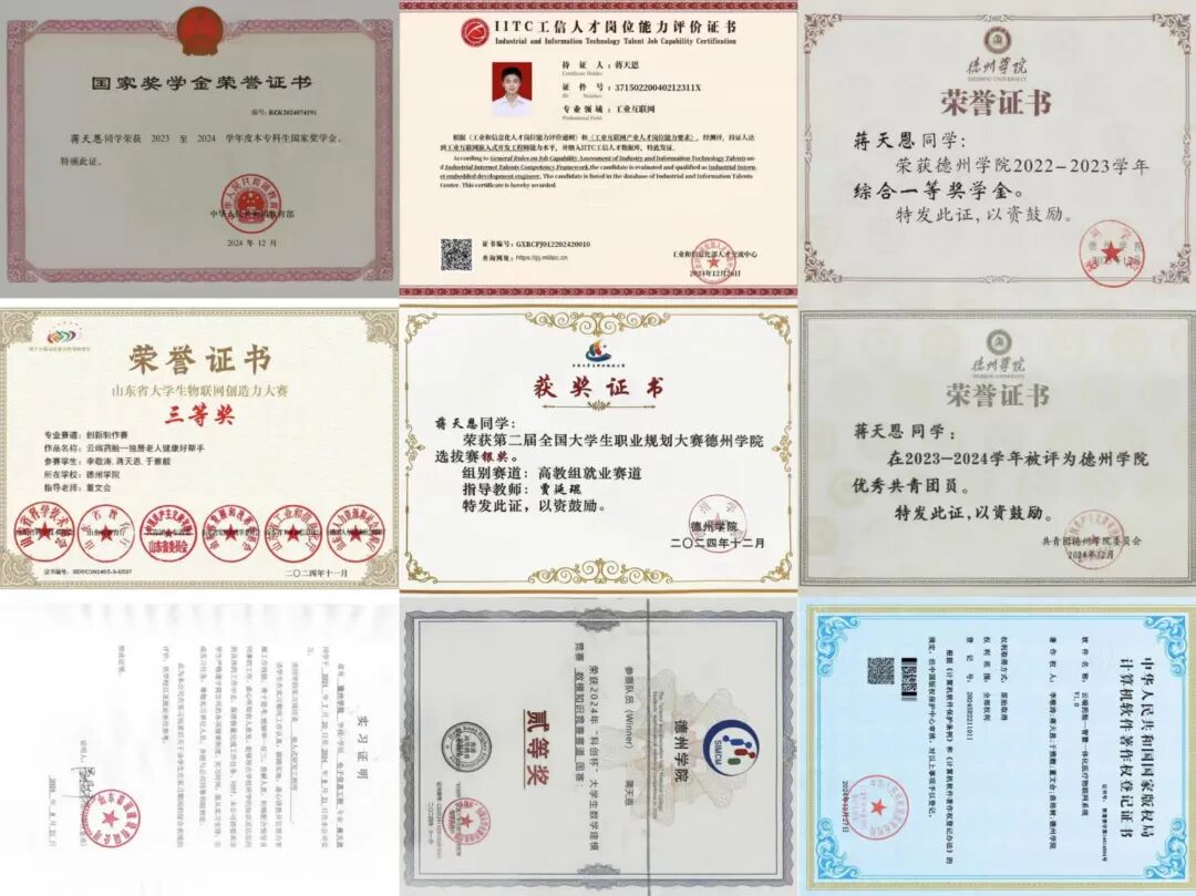 2023-2024学年学业成绩与综合成绩均位于专业第二名,平均学分绩点为4.07。曾获2023-2024省政府奖学金,德州学院综合一等奖学金,优秀共青团干部等荣誉称号;第十五届蓝桥杯单片机大赛三等奖,山东省光电设计科技创新大赛三等奖,2023年全国大学生集成电路创新创业大赛校赛二等奖,2023年全国大学生电子设计竞赛校赛荣获二等奖,德州学院 2023 年篮球联赛女篮第八名荣誉。