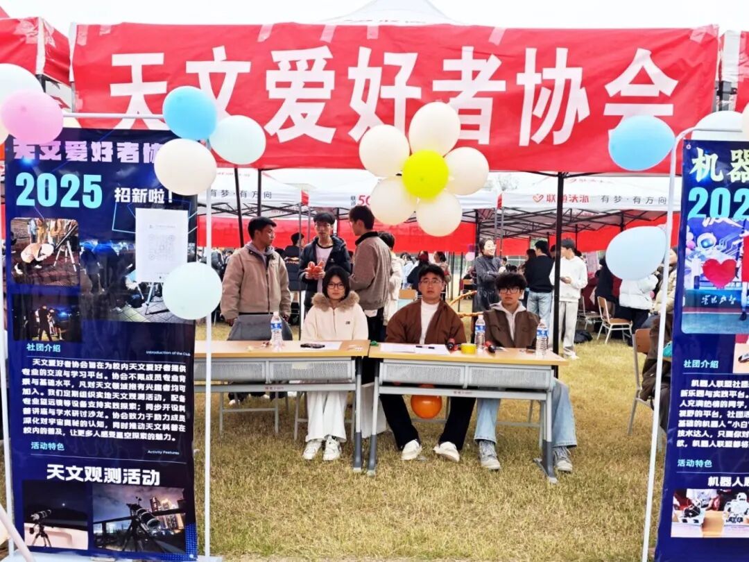 天文爱好者协会以专业设备成为亮点,现场架设专业级天文望远镜,邀请同学们近距离观察镜片结构、体验简易观测。针对野外观测、零基础学习等疑问,社员逐一耐心回应,并详解天文知识培训、星空摄影实践等培养计划,让同学们对天文探索满怀期待。