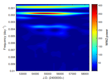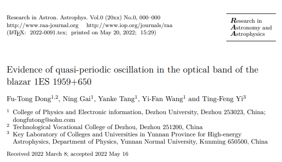 开云kaiyun体育董富通博士等人整合了上海天文台、国家天文台及国际著名的天文观测数据库SMARTS等的观测数据,对blazar天体1ES 1959+650近16年的光学数据进行了分析,并发现准周期信号的存在。