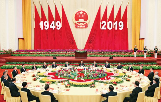 2019年9月30日晚,庆祝中华人民共和国成立70周年招待会在北京人民大会堂隆重举行。习近平、李克强、栗战书、汪洋、王沪宁、赵乐际、韩正、王岐山等党和国家领导人与4000余名中外人士欢聚一堂,共庆新中国70华诞。 新华社记者 黄敬文/摄