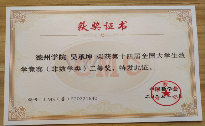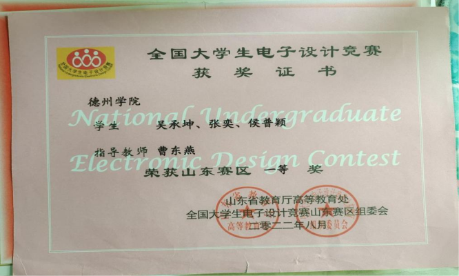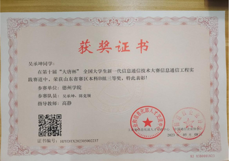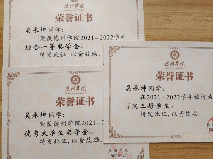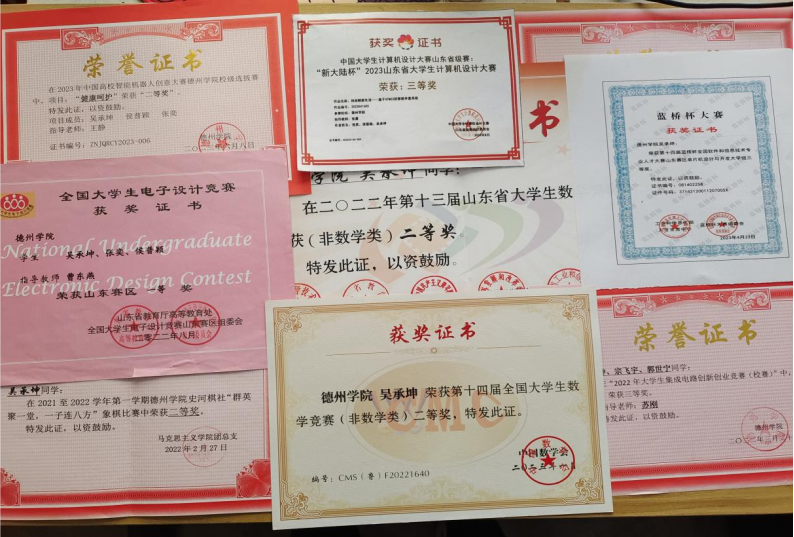 吴承坤,共青团员,开云kaiyun体育物联网工程(移动互联)专业学生。2021-2022、2022-2023学年连续两学年学业成绩和综合成绩均位于专业第一名,2021-2022学年荣获德州学院综合一等奖学金、优秀大学生奖学金、三好学生,2022-2023年荣获德州学院综合一等奖学金、优秀大学生奖学金。获全国大学生数学竞赛二等奖,全国大学生电子设计竞赛山东赛区一等奖,大唐杯全国大学生新一代信息通信技术大赛省赛三等奖,蓝桥杯全国软件和信息技术专业人才大赛省赛三等奖等省级奖项6项,全国大学生电子设计竞赛德州学院校赛一等奖等校级奖项5项。