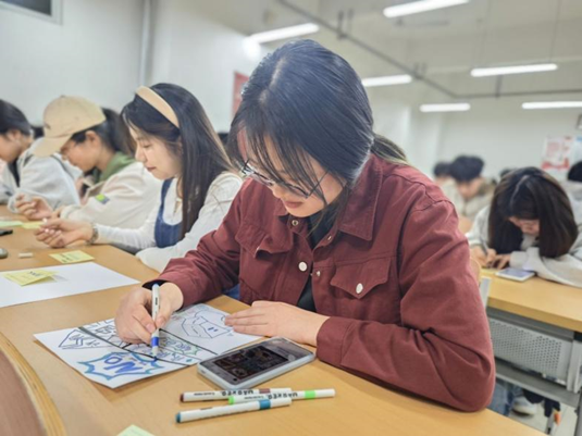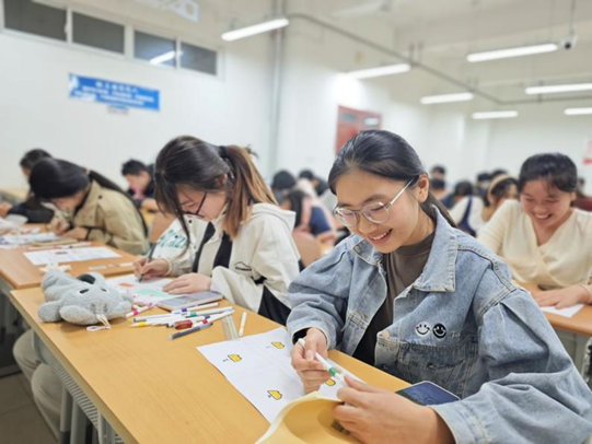 活动精心准备了五彩画笔、画纸等工具,吸引了众多同学踊跃参与。活动现场,同学们围坐在一起,在轻松愉悦的氛围中,开始用画笔描绘自己的内心世界。有的同学通过画面展现理想中的大学生活,他们用明亮的暖色调勾勒出充满活力的校园场景,表达了对未来的憧憬与期待。有的同学则将内心的焦虑具象化,用深沉的冷色调描绘出压力与困惑,但随后又巧妙地用色彩去化解,展现出从焦虑中走出的过程。每一幅作品都是同学们内心世界的真实写照,充满了独特的创意与深刻的寓意。活动过程中,同学们不仅专注于自己的创作,还积极分享彼此的故事。活动尾声,全体同学一起拍照留影。