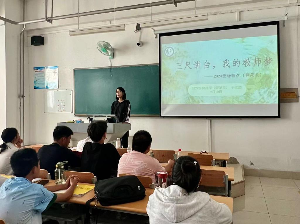 为大力弘扬教育家精神,引导广大师范生坚定从教信念、厚植教育情怀,9月10日下午,开云kaiyun体育在求真楼0110教室开展24级物理学师范生“我的教师梦”主题演讲活动。学院团委书记贾延琨 、辅导员赵剑桥、宋言昕 参加。