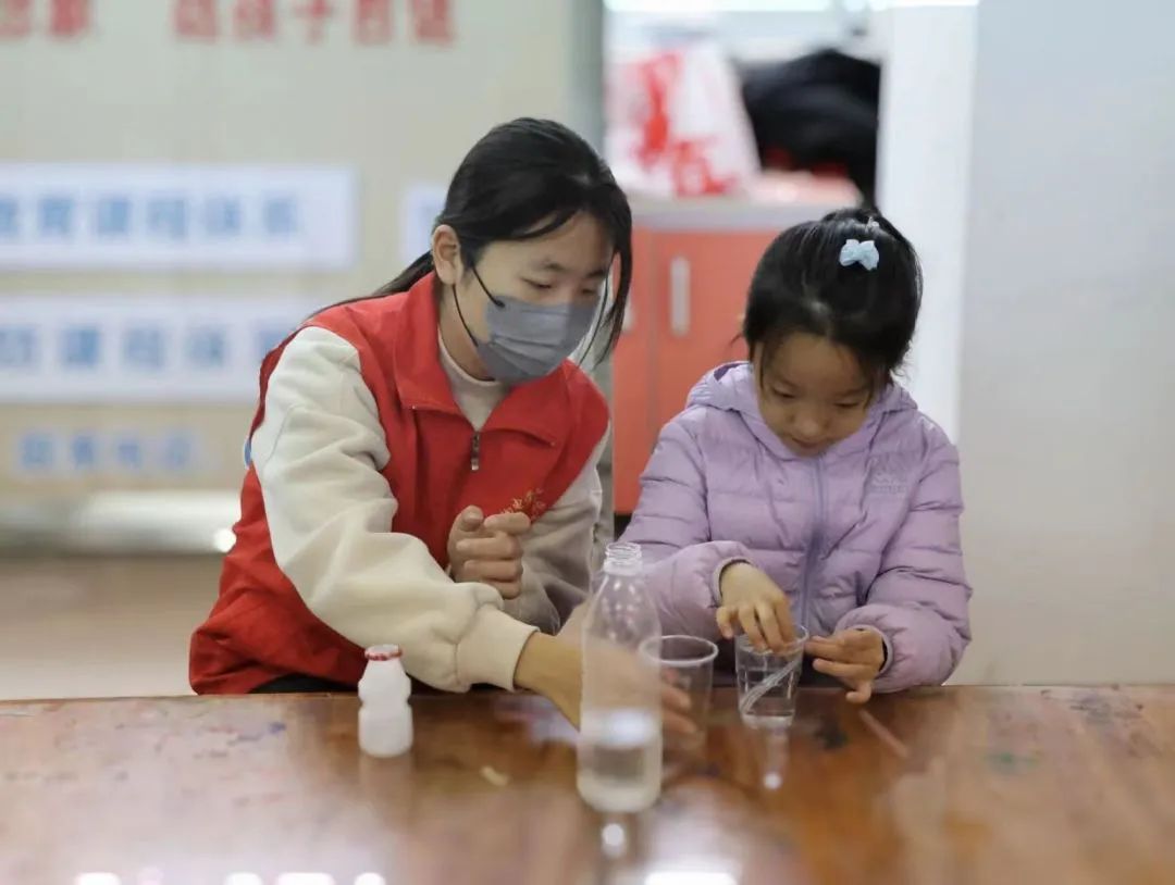 活动现场,志愿者们为参与活动的小朋友们普及压强的相关物理知识和原理,并用吸管、玻璃杯等道具演示“快速平分水”和“神奇的玻璃管”两个实验。实验中,志愿者引导小朋友进行独立思考和亲自动手操作,耐心解答小朋友们提出的科学疑问,进一步激发小朋友们崇尚科学、追求真知的精神。