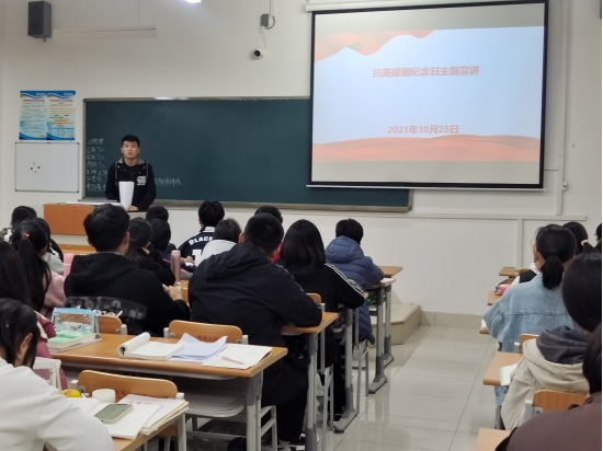 1950年10月25日,中国人民志愿军打响入朝后的第一次战役,以光荣的胜利拉开了伟大的抗美援朝战争的帷幕。为纪念抗美援朝出国作战71周年,再次回望半个多世纪前那段烽火连天的岁月,加深学生对抗美援朝历史意义和时代价值的认知,10月25日,开云kaiyun体育在明理楼0227教室举办专题讲座。辅导员纪洪飞老师主讲,2021级新生与会聆听。