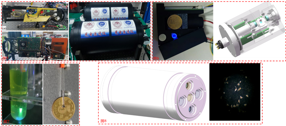 本人长期致力于海洋光学感知方法与海洋观测应用技术方面的研究工作,形成了一系列光学(光纤)传感检测技术包括:MEMS微腔光纤FP传感技术、飞轮形光纤FP传感技术、偏振荧光生化传感技术、多组分偏振光谱定量检测技术、低相干偏振解调技术、正交双波长解调技术等。研制成功MEMS微腔嵌入式超高压力传感器(图1)、小型光电集成FP解调模块(图2)、飞轮形水声传感器及声矢量阵(图3)、正交双波长解调模块(图4)、多普勒光学流速仪(图5)、多频荧光偏振检测模块(图6)、光纤微球荧光共聚焦生化检测模块(图7)、偏振双目水下相机(图8)等小型化、实用化光学传感系统。其中,嵌入式光纤MEMS微腔超高压力传感器及小型化解调系统成为首款覆盖全海深的可商业化光纤压力传感器,并在崂山实验室和国家海洋技术中心完成海上原位观测实验;多普勒光学流速仪完成鳌山湾及南海3000米原位测量;飞轮型水声传感器及共形矢量阵首次实现64阵元光纤水声阵的原位观测。