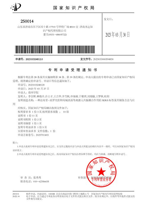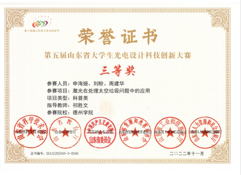 除了日常的专业学习,该生还积极参加各种科技竞赛,例如山东省大学生物理实验大赛、山东省大学生光电设计竞赛、山东省物联网创造力大赛等,目前获得省级一等奖1项,二等奖2项,三等奖4项,校级一等奖4项。此外,该生还积极参与到实验室科研活动中来,加入了指导教师的科研创新团队,得到了初步的科研训练,掌握了部分创新实验技巧,提高了科研认知与素养。在实验室老师的带领下,现有一篇发明专利已进入实质审查阶段。目前申请并主持的创新创业项目已获得国家级立项,支持经费20000元。经过不断努力,现已成为德州学院山东省生物物理重点实验室创新拔尖班的一员。